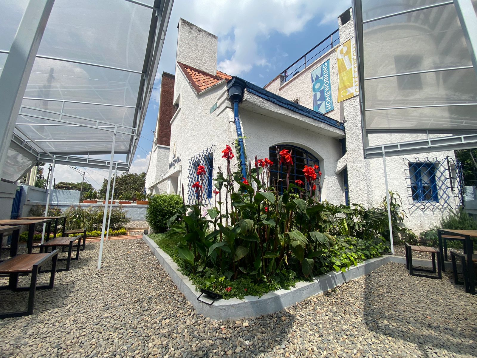 La Diagonal is a multicultural space with a strategic location in a heritage house in Bogota, near the Javeriana University between Carreras 13 and Caracas, one block from the AV 39 Transmilenio station. It is the place where ideas find their home, it offers different enterprises, companies and users the opportunity to tell their story, offer their products and services in a versatile way, generating conscious and sustainable experiences, in a fraternal environment with a fair price. It has different spaces divided into three floors, in the first one you will find a specialty coffee adapted for those who want to enjoy a real coffee and a good pastry in an outdoor and natural environment. On the second floor you will find office space and a meeting room, and finally, on the third floor you can enjoy an outdoor terrace with a beautiful view of the hills of Bogota.